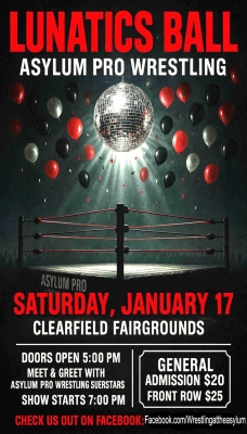 Come out and Celebrate the New Year and The Lunatic Crazii Shea's birthday with us!! There will be a night full of action packed matches including matches for The APW Heavyweight title, The APW Hardcore title, The APW Tag Team titles, The DOW Heavyweight title, and The Defiant Asylum Qweens title. Dont forget it's time for Asylums annual balloon drop with prizes inside the balloons. Come out and enjoy the night with the Superstars of Asylum Pro Wrestling and Defiant Order of Wrestling.