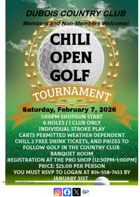 chili, 2 free drink tickets, and prizes to follow golf in the country club banquet room