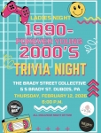 Jump back to a favorite decade; 1990-2000 and relive all your favorites from music, fashion, food and more; on Thursday, February 12, 2026 at 6 PM at The Brady Street Collevtive, 5 S Brady St, DuBois, PA! Trivia and music by Play Nice Entertainment to keep you entertained all evening! What was a popular spark in 1990... a personal pizza! You will get just that from LaVita Bella pizza truck; parked right outside to bake your pizza fresh and deliver In! A look ahead at a popular trend coming after 2000 was the dirty soda! You'll enjoy a dirty soda spiked flight from Tipsy Lane. Additional flights or drinks available to purchase but ticket includes 1 flight Of 4! Come dressed in your favorite 1990-2000's fashion for an extra chance at a prize! Prizes will be given for trivia! You will be put in teams per table so if you're coming with friends get your tickets together or reach out to The Brady Street Collevtive to be sure they group you together!