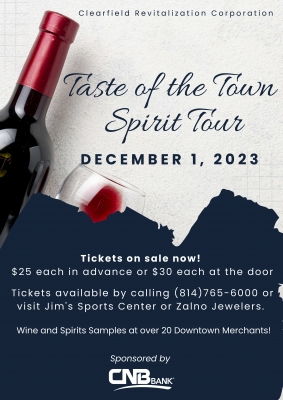 Tickets on sale now! $25.00 each in advance or $30.00 each at the door. Tickets available by calling 814-765-6000 or visit Jim's Sports Center or Zalno Jewelers. Wine and Spirits Samples at over 20 Downtown Merchants.