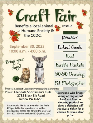 If you would like to be a vendor, the fee is $15 per table. For questions or further information, please call or text the CCDC at 814-203-3380 or ccdc16627@yahoo.com.