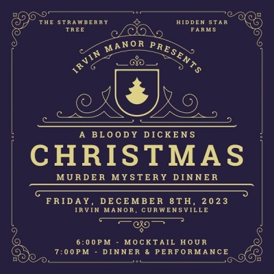 Murder Mystery Dinner Friday, December 8th, 2023 Irvin Manor, Curwensville 6:00pm - Mocktail Hour 7:00pm - Dinner & Performance $50 per person, includes dinner, drinks and performance (only 40 tickets available) It has been 23 years since Miss Havisham was left at the alter by her fiancé. Her mansion is now in ruins and her days are spent in a haze of madness. A skeleton has recently been dug up on the property. Could this be Miss Havisham’s lost fiance? Is it possible that after all these years she wasn’t in fact jilted? But who committed this atrocity? A plan is set forth, as the very guests that were at her wedding day 23 years ago receive invitations to spend Christmas Eve at the mansion, and within Christmas merriment, a murderer will be unmasked. Dinner Menu: Prime Rib, Candied Carrots, Parsley Potatoes, Coconut Creme Pie Link to book: https://square.link/u/juKm9T2F Presented in association with The Strawberry Tree and Hidden Star Farms