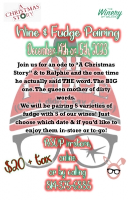 Oh, Fudge! The Winery at Wilcox in DuBois is having a Wine & Fudge Pairing on Thursday, December 14th and Friday, December 15th. The Winery will be pairing 5 delicious varieties of fudge with 5 of their wines. Flights and fudge will be available to enjoy on the 1th and 15th. Cost is $20 plus tax. Place your order in store, online, or by calling 814-375-6885!