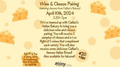 We've teamed up with Calliari's Italian Bakery to bring you a delicious wine and cheese pairing. You will receive 5 samplings of cheese and a 1oz. flight of 5 wines that compliment each variety. You will also receive some delicious Calliari's famous Italian Bread!