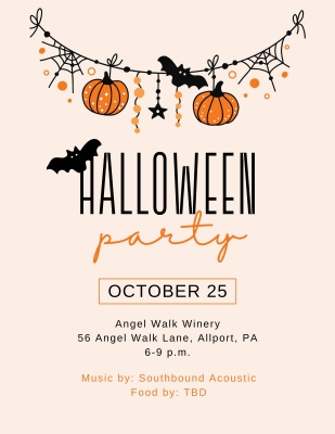 Join us for a Halloween Party at Angel Walk Winery! Southbound Acoustics will be playing from 6-9 p.m. and Adam & Nancy's Paninis will be serving up some delicious sandwiches! Dress up in a costume if you'd like. More information coming soon!