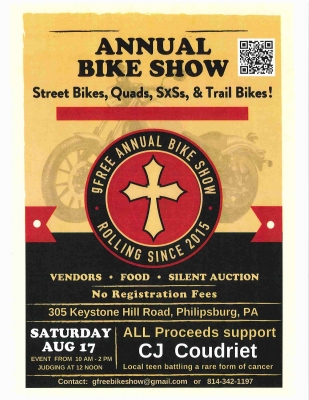 Saturday, August 17th from 10am to 2pm with judging at 12 noon. An Evangelistic outreach to the motorcycling community. Featuring a judged bike & quad show with trophies, vendors, Silent Auction, and free food. No registration fees! All proceeds support CJ Coudriet a local teen battling a rare from of cancer.