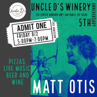 Help us celebrate Uncle D’s 5th Anniversary with Matt Otis Solo Acoustic Friday August 2nd! We will have pizzas from 1:00PM-8:00PM, wine slushies, beer, and Matt will be performing from 5:00PM-7:00PM. There will be tons of giveaways provided throughout the day to customers who attend the event. We hope to see you!!