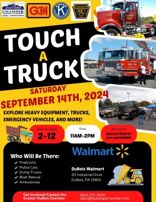 Does your company or organization have a unique truck or vehicle that you'd like to display at Touch A Truck? The Greater DuBois Chamber of Commerce, Glenn O. Hawbaker, DuBois Walmart, DuBois Kiwanis Club, and WPAL are holding this exciting event on Saturday, September 14th at the DuBois Walmart from 11:00am to 2:00pm. The event is to display a wide variety of heavy equipment, trucks, emergency vehicles, and fun “stuff’” for kids to climb on, honk horns, and explore.