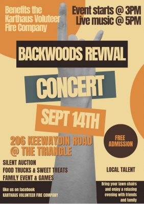 Come join us for our annual community event with our local talent, Backwoods Revival! Bring your chairs, family and friends! Admission is free. There will be a silent auction, food, sweet treats, games, rip tickets and more! Thank you for coming out and supporting our local Fire Department.