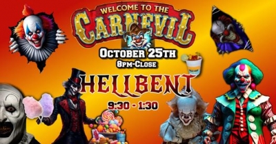 This October, the CarnEvil breaks through the veil! Clowns, jugglers, acrobats, & showmen, straight from the fiery pit Itself. Enjoy the candy at your own peril. Rock out to the HELLBENT Lords of the 7th Realm from 9:30 to 1:30! Enjoy less the greedy activities & Find out which performer is the most evil among us all with the $100 Costume Contest!!