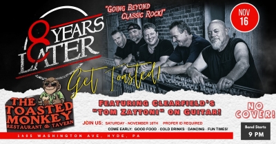 Oh boy, oh boy oh boy! The boys from 8YL are heading back to the Toasted Monkey... this time with local boy "Tom Zattoni" on guitar! It was a great show last time at The Monkey, but we can't wait for this one! Grab a group and come on over and show Tom some Love! Music starts around 9pm and there is NO COVER!