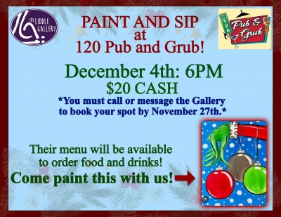 The Liddle Gallery will be offering a public painting event at 120 Pub and Grub on December 4th, 2024 starting at 6PM, until about 8PM.