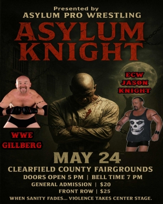May 24 at the Clearfield Fairgrounds…GILLBERG will be special guest enforcer for Asylum Pro Wrestling!! And Jason Knight from ECW will be taking on Marcus Waters for the Heavyweight Championship!!