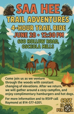 Come join us as we venture thorugh the woods with constant changing of elevations. After we return, we will gather around a cozy campfire, and enjoy complimentary hamburgers and hot dogs. For more information and to RSVP call Raymond 814-577-6201