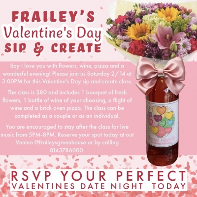 Looking for the PERFECT Valentine’s Day date night? We’ve got you covered! Join us for a SIP & CREATE event on Saturday February 14th at 3:00PM. The class is only $80 and includes a brick oven pizza, a flight of wine, fresh flowers and a bottle of wine! The class can be copleted as a couple or as an individual. Make a day of it and stay for the live music at 5PM-8PM with Derek Heidel. Details are listed below! BOOK TODAY as spots will fill quickly. Payment to reserve your spot can be made via Venmo @fraileysgreenhouse or by calling 8143786000.