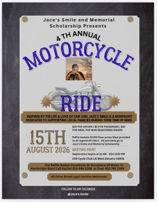 registration begins at 11 am KSU up at 1230 pm. 20 dollars per driver / 5 dollars for passenger. all other street legal vechiles welcomed. all proceeds benefit Jace's Smile. a nonprofit organization in honor of our 13 year old son. We help local families financially in their time of need. we also have an annual scholarship. Ride will start at Clearfield Cycle Club and end at the Clearfield Cycle Club. route of ride to be announced at later date. non registered riders/passengers can attend, will be 10 dollars for meal for all non registered riders/passengers. will have raffle baskets, 50/50 and more
