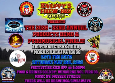 Kneppy's Fireworks presents the 2026 22nd Annual products demo and pyromusical finale!