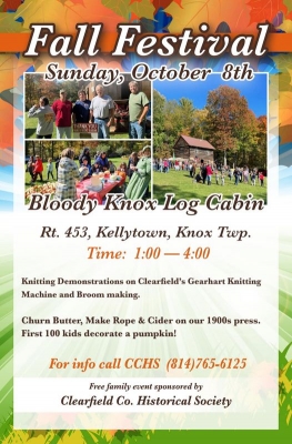 Come and learn how to make Churn Butter, Make Rope & Cider on our 1900s press. The first 100 kids get to decorate a pumpkin. Knitting demonstrations on Clearfield's Gearhart Knitting Machine and Blacksmithing.